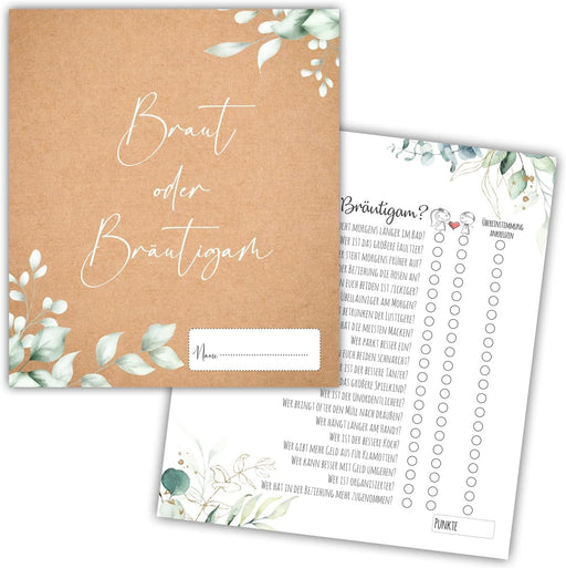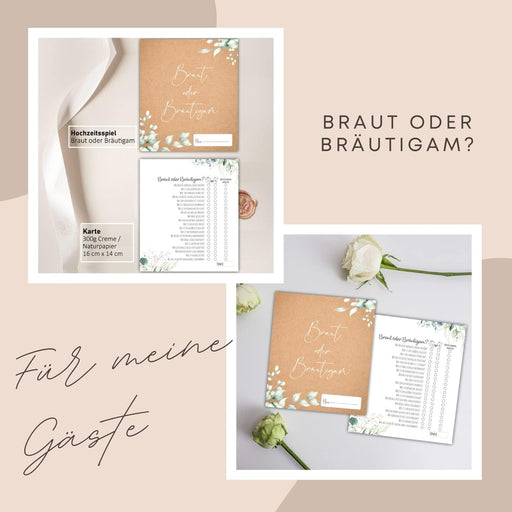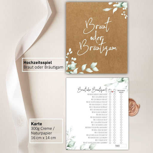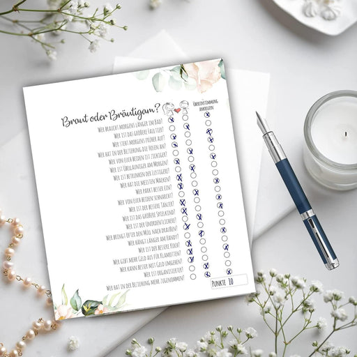 Vollständige Details anzeigen25 x Braut oder Bräutigam auf 300g Cremepapier | Hochzeitsquiz Hochzeitsspiel